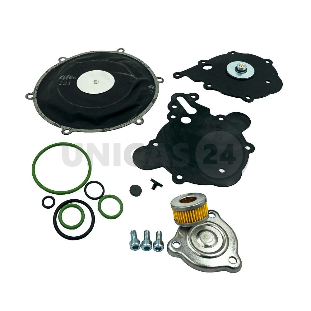 Komplet naprawczy to zestaw najszybciej zużywających się części reduktora: gumowych membran, uszczelek i podkładek, dopasowanych kształtem i rozmiarem do konkretnego modelu reduktora. Wymiana tych akcesoriów jest najprostszą (i najtańszą) metodą polepszenia funkcjonowania reduktora w przypadku wystąpienia takich objawów, jak: trudności z odpalaniem, gaśnięcie silnika, nierówna praca, duże spalanie paliwa.
