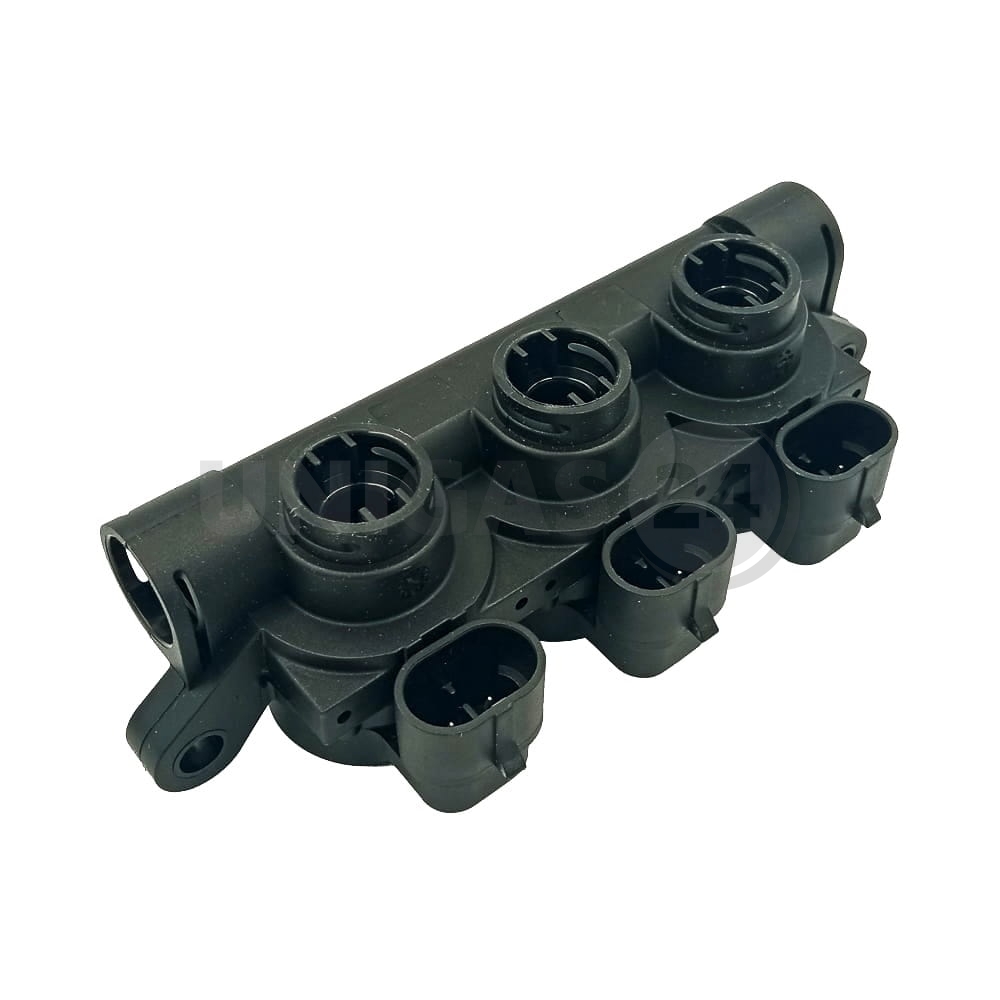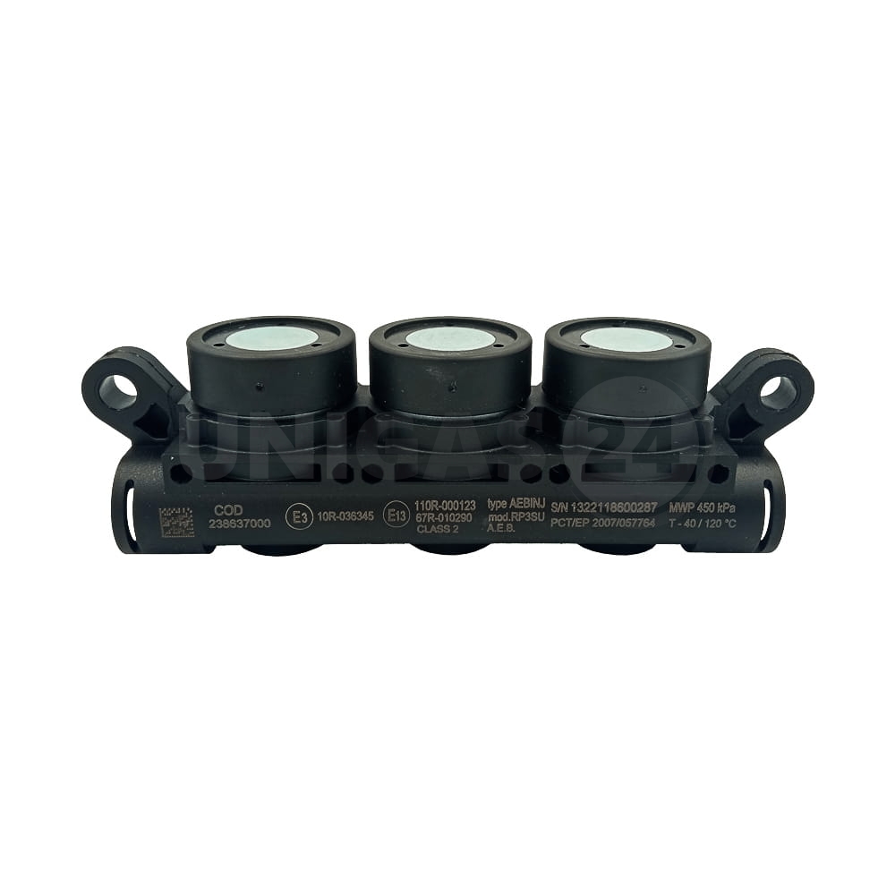 Listwa wtryskowa typ AEBINJ model RP3SU włoskiej firmy AEB. Trzysekcyjna listwa wtryskowa w korpusie z tworzywa sztucznego, bez króćca wlotowego, zaślepki oraz dysz kalibracyjnych, wykonana z tworzywa sztucznego.