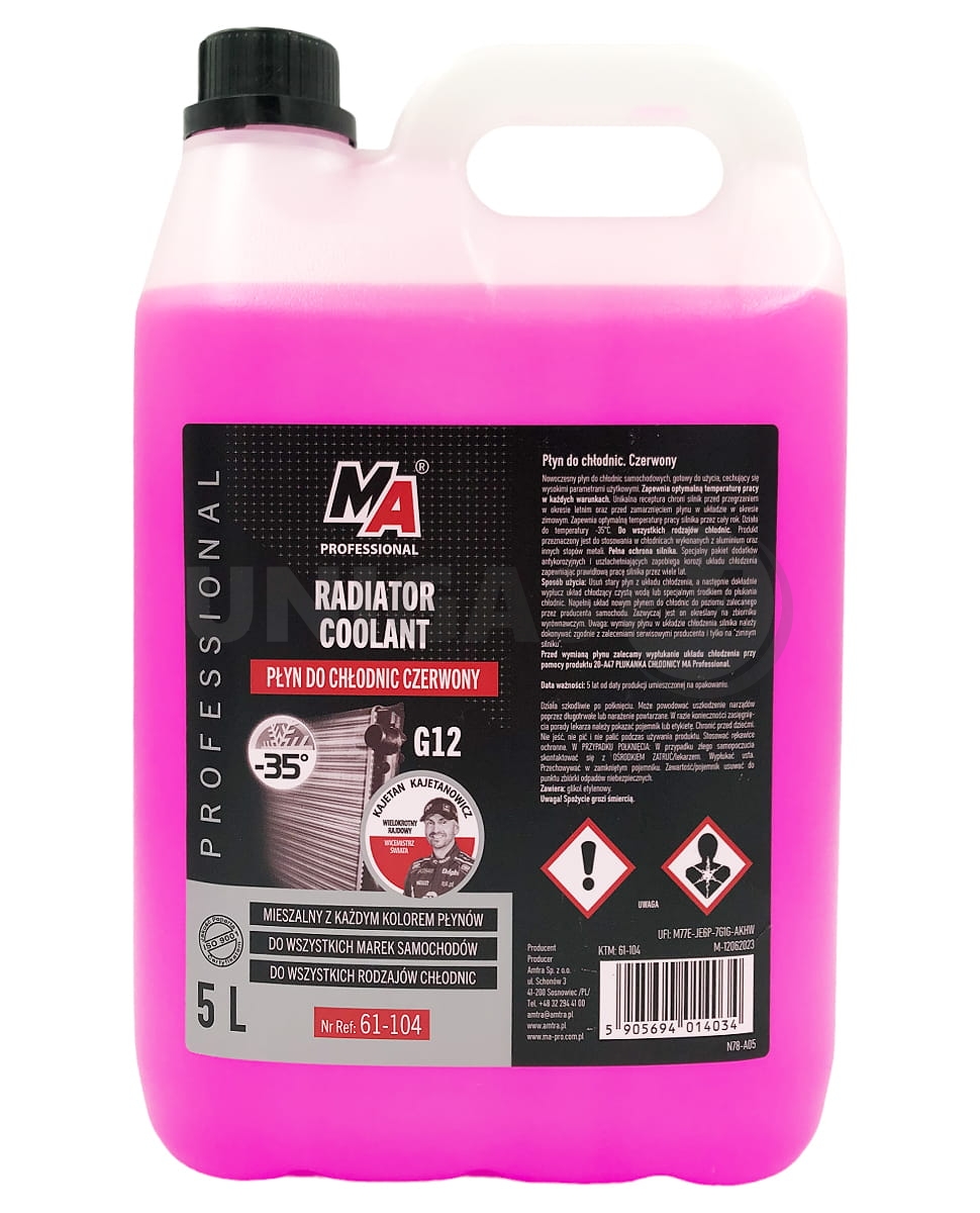Płyn do chłodnic Moje Auto 5L przeznaczony do wszystkich marek i rodzajów samochodów. Czerwony Radiator Coolant można mieszać z wszystkimi płynami do chłodnic niezależnie od koloru.