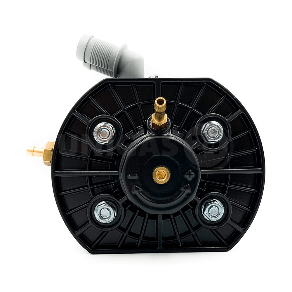 Reduktor do systemów sekwencyjnego wtrysku gazu do silników o mocy do 290kW (395KM) z zewnętrznym elektrozaworem i filtrem (dwa zawory). Zasilany rurką miedzianą Cu o średnicy fi6. Klapkowy zawór regulacyjny.